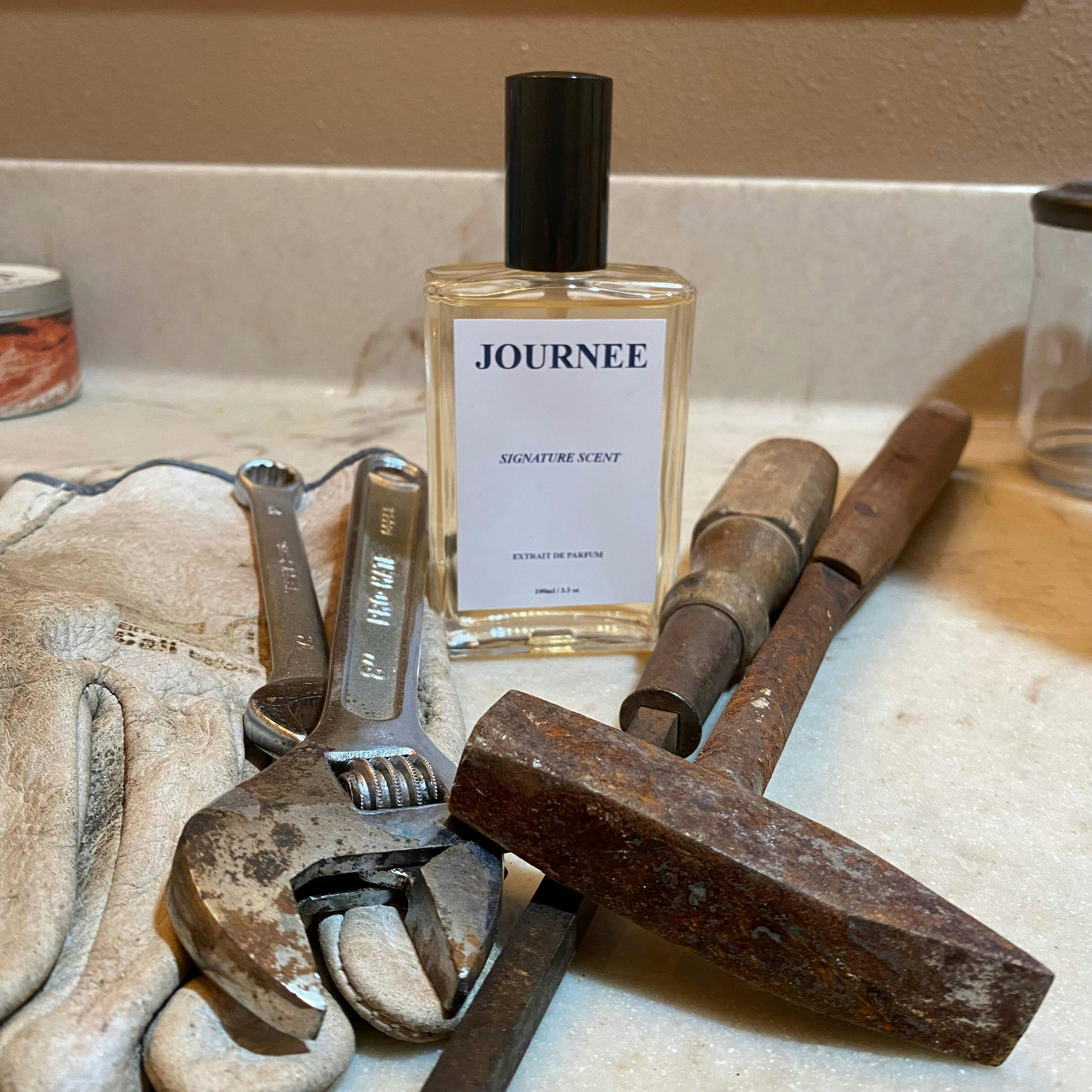 Step into a world of rugged sophistication with Journée, a cologne designed for those who live boldly and embrace every adventure. This intoxicating blend opens with the smoky warmth of fireplace embers, evoking memories of crackling wood and quiet reflections. As the scent unfolds, the rich, worn-in elegance of leather emerges—smooth, powerful, and timeless. At the heart there weaves a velvety, woodsy depth, adding a refined balance of comfort and strength. Finally, the unmistakable essence of an old car garage drifts through—a nostalgic nod to grease-stained hands, polished chrome, and the thrill of the open road.